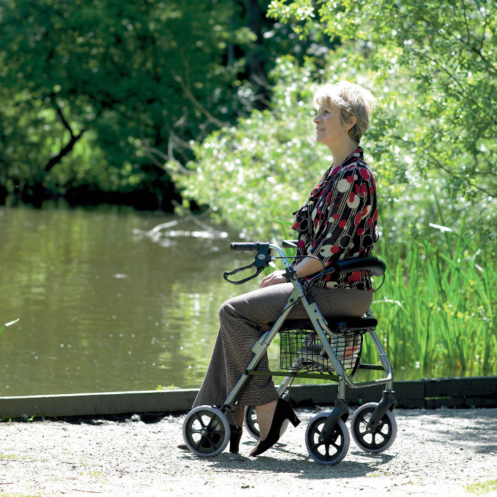 Los frenos especialmente diseñados para accionarse aún con movilidad limitada en las manos, tienen posición de “parking “que bloquea el rollator para mayor seguridad.