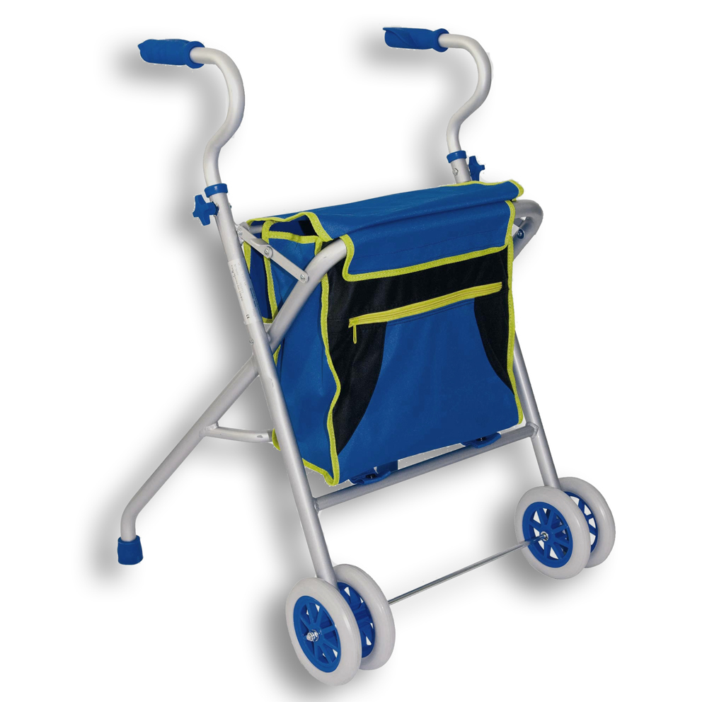 Caminador plegable, con cuatro ruedas delanteras, regulable en altura, muy ligero y fácil de plegar. Lleva incorporada una práctica bolsa portaobjetos.