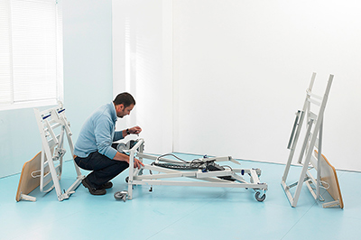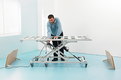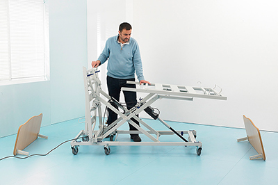 - La ergonomía mecánica de la cama permite al instalador respetar las posturas recomendadas para prevenir las TMS (Trastorno Músculo-Esquelético) durante la entrega, montaje y desmontaje de la cama. El poco espacio que ocupa y el almacenaje sobre sus propias ruedas facilita el desplazamiento en cualquier situación (ascensor, pequeños vehículos...) Una cama autoportante sin kit de transporte.