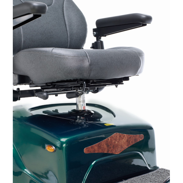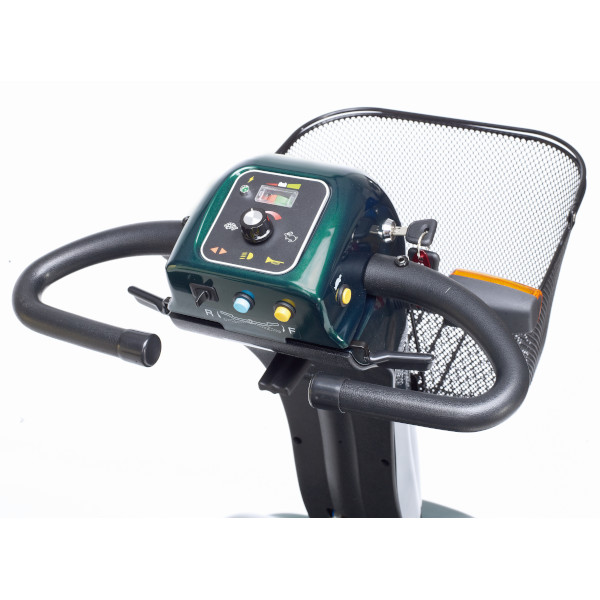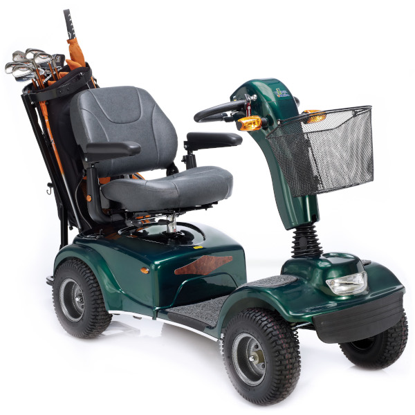 Ruedas anchas preparadas para campo de golf. Cables colocados dentro de la cubierta de timón para crear una apariencia atractiva. Cómodos apoyabrazos acolchados con la altura, ancho y ángulo regulable. Sistema de luces integrado: faro, luces traseras, intermitentes y luces de emergencia. Manillar ajustable. Cesta portaobjetos incluida. Porta palos, cesta plegable y portabastones como accesorio opcional. Asiento giratorio, abatible y regulable en altura de 38 a 45 cm.
